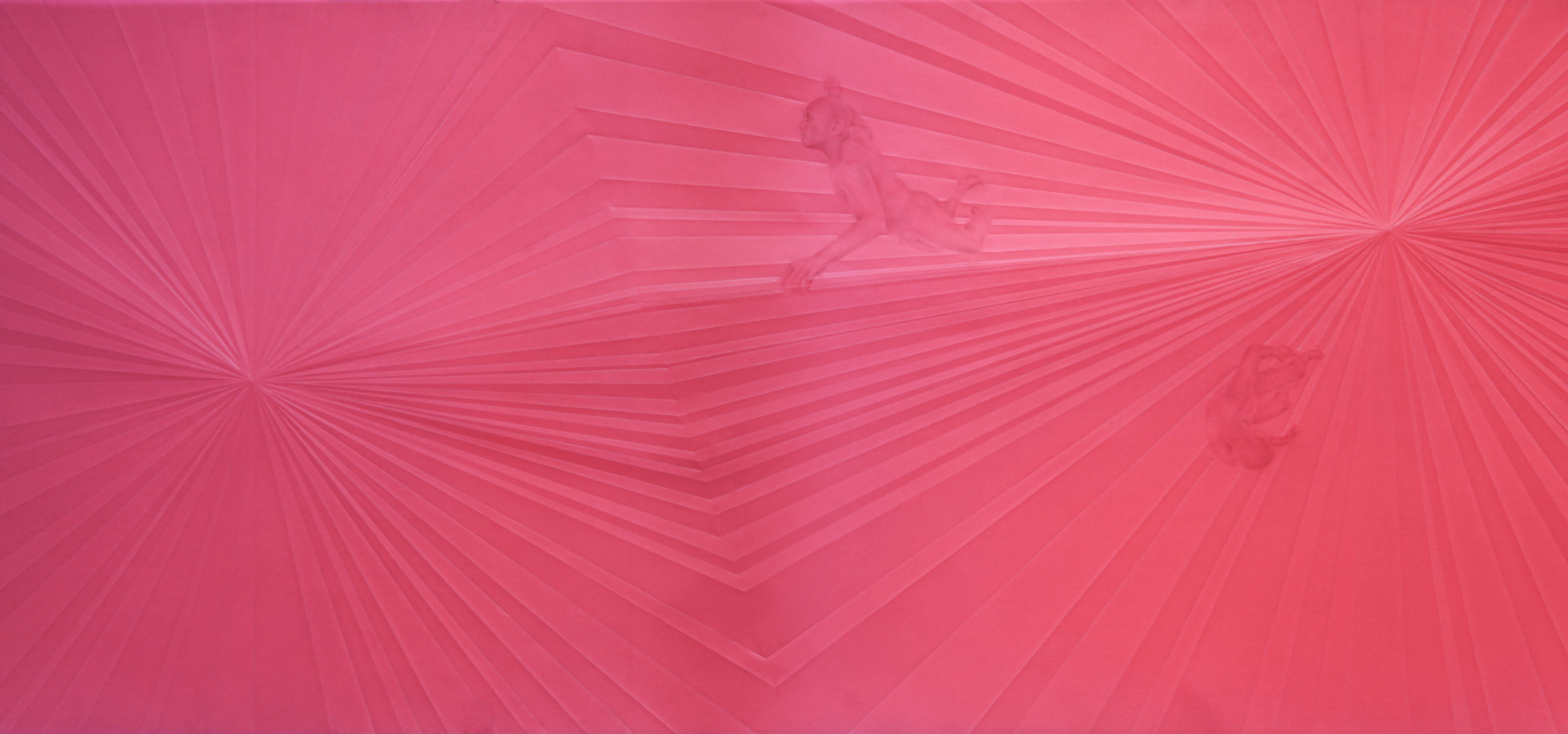 Sandeep Mukherjee’s Untitled (Starburst) is a panel that was originally part of a five panel site-sensitive series composed in 2002 and his Centrifugal work (also site-specific) was created in 2005. The latter marks a significant shift to the abstract in his practice, whereby he incorporated his own body as a recurring motif, of which Untitled (Starburst)was one of the last. The earlier work shows the artist’s corporeality within folds and unfoldings across a non-linear planetary song. His head pulses to Macy Gray and Daft Punk and his body is thrown across the rosy expanse, disappearing into its celestial creases and almost violently ejaculated from starbursts of his own making. Based on nude photographs, the artist’s topological exploration of representing his body springs from an urge to unground and untether it from its gravitational constraints, along with the limitations of the corporeal itself, but also constantly returns to these through its sharp perspectival meanderings. While Centrifugal has seen many iterations across galleries in the U.S., the geopolitical realm Mukherjee calls his primary home, Spectral Theatre is its first stage in India, nearly two decades after its conception. Acrylic ink and embossed drawings disperse, refract, radiate, diffract, amalgamate in ectoplasmic spirals and birthmarks across the vast skins of Duralene. The ‘blank’ sections of these panels once, too, held paint, subsequently erased by Mukherjee. The artist’s body has become spectral within the motions of non-human configurations, and it gestures to our spectatorial bodies and their constantly transmuting distances to his work. Centrifugal thus indexes the corporeal, even as it challenges its representational form within his praxis, as evident in Untitled (Starburst).