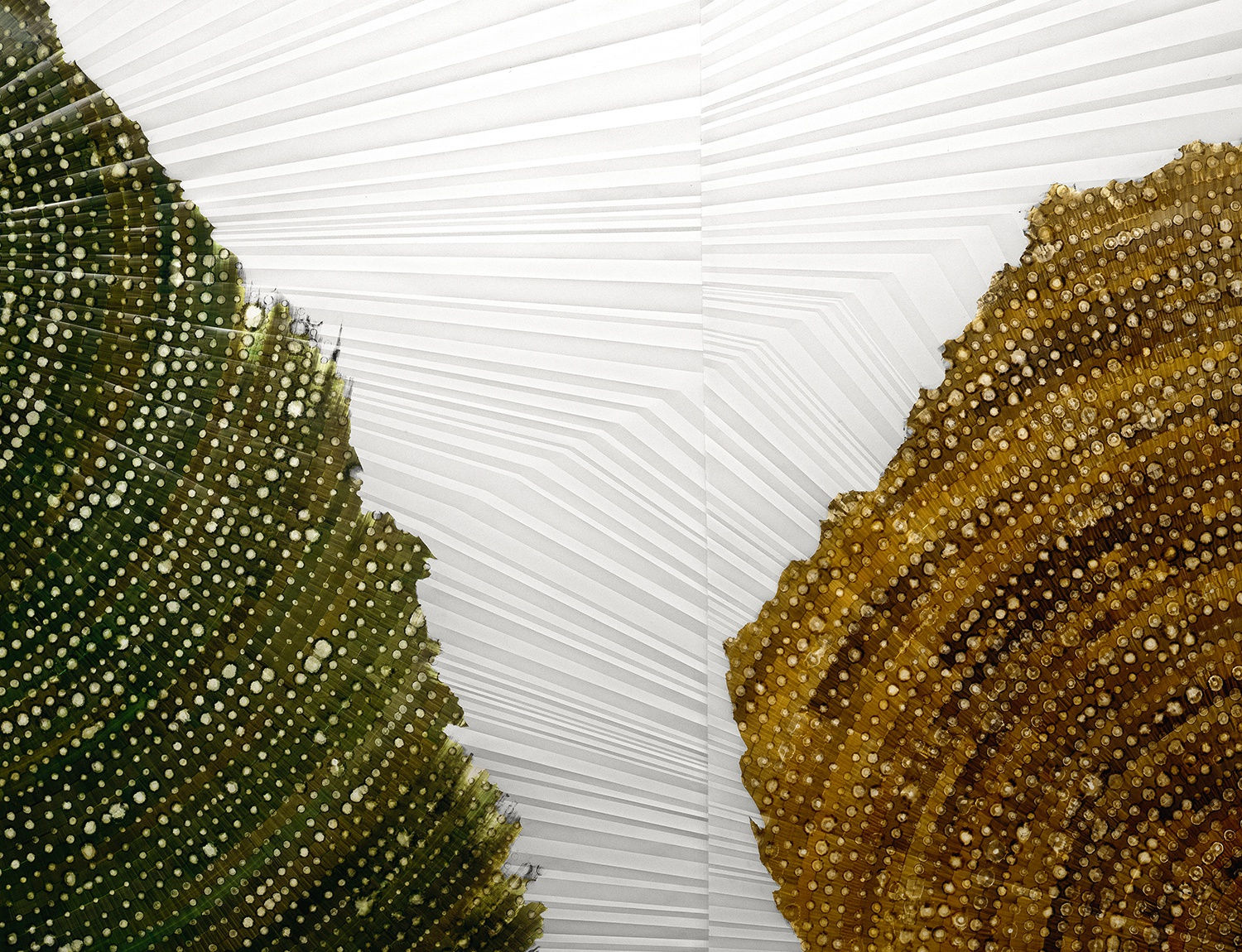 Glasshouse Deep renders the most infinitesimal of bodies into cosmic ones, Untitled (Starburst) and Centrifugal make intricate, abstract studies of them. They play with the ontological and representational thresholds of the human body— the pointillist possibilities of returning to ourselves through spectral deviations, the phantasms lingering in the imaginary theatres of skies and seas, screens and surfaces. Almost chiral, the radial symmetries of Mukherjee’s forms in Centrifugal and the radiating lines in Untitled (Starburst), and Devasher’s diatoms appear to nearly mirror one another and then disappear before the silhouettes of similarity can be fully demarcated, but leave enough of an impression for us to enter through the haunting channels their works create. An assemblage of luminescence-loops and oscillations between screen and Duralene, glassy exoskeletons and planetary patterns, these works are theatres and actors hosting one other. Light becomes the phantasmic director concatenating these motions, passing the thresholds of uncanny imaginaries and retinal screens. We are left aching with vibrant ghost-encounters, suffused with dislocations, haunted by their infinite returns.