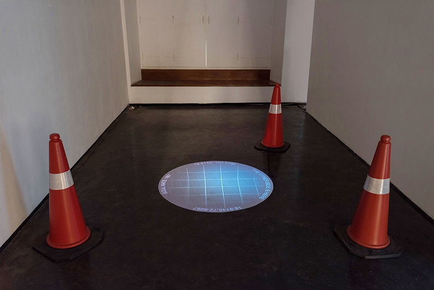 Back to Project 88 and the idea of it being on its side, New York based artist Kirsten Mosher connects Project 88 to its geographic antipode (the coordinates that could be found by digging through the gallery floor, through the core of the Earth, and out the other side) through a 1:1 scale video projection of a digital rendering which allows us to imagine the undulating ocean surface found there (making an uncanny twin with the rendering process found in Lucy Raven’s Deccan Trap earlier in the exhibition). 8688 launches the first chapter of Mosher’s long-term project Soul Mate 180°, exploring the idea of the Geographic Soul Mate as both an intimacy created by acknowledging distances as well as a relationship with the other side of earth not as a polarity or opposite but as a fluid, shifting continuum that extends within and beyond the planet. A common misconception is that we find land on the other side of the planet below our feet; in fact, only 15% of antipodes are land-based (or 4.4% of the Earth’s surface), our antipodes are mostly found on water. The place of the antipode might be a fixed point, but what we find there, isn’t, since water is constantly moving.