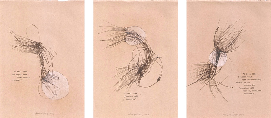 In Vinit Like-ness, emotional attachment to the named subject intensifies this effect of preempting complete knowledge about personality. Because the object of portraiture is not a person but the feelings of an intimate. The qualitative features of a person are reduced to a toolbox of looping and swirling filaments, linking and spewing out of pouch-shaped outlines. Executed on paper-bag brown surfaces, and sometimes filled with gossamer white, these formations, as fluid as deep-sea light-refracting jellyfish, reveal little of their mysteries through the typed snatches of texts that appear alongside