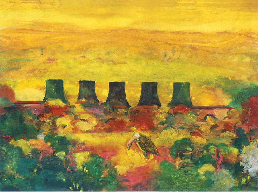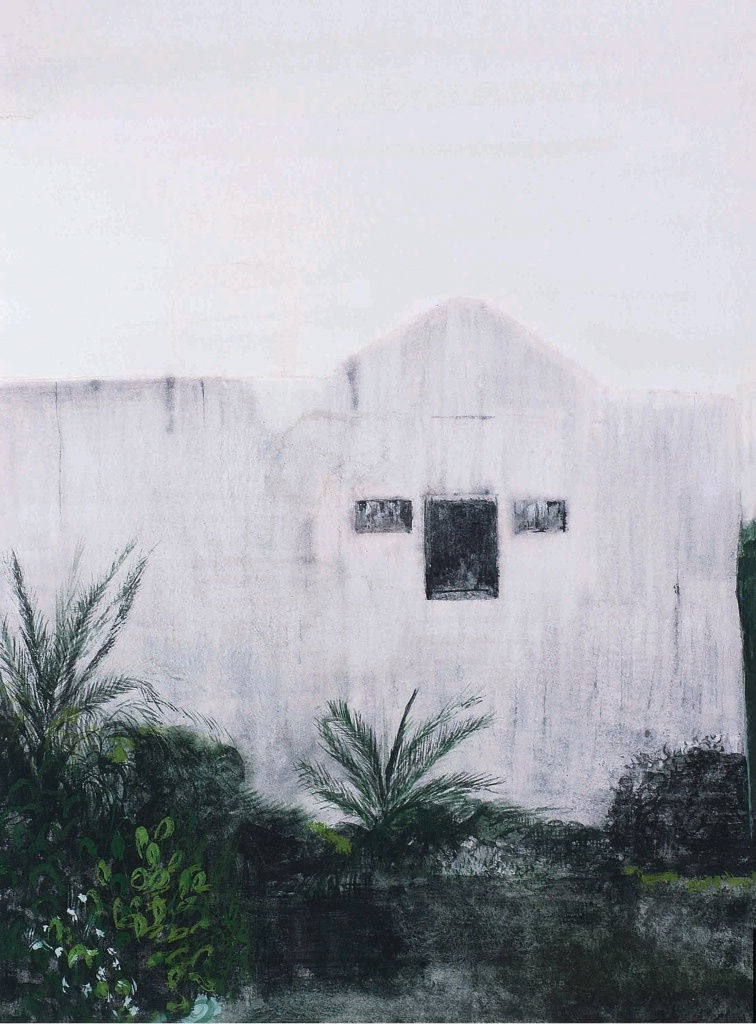Home (2014) came soon after. This early work in casein is a picture of the artist’s natal home in Moodbidri village, Karnataka. But the decision to lend the image the spectral character of a building in an image of Mumbai’s Zoroastrian funeral precinct the Temple of Silence came only after his mother’s death that year. That said, casein’s materiality also has a fair share in the picture’s affect. Casein is fairly brittle when dry and therefore does best on inflexible supports such as board or on well-sized canvas. A paper support such as that used in Home calls for thin applications, such that the opaque but spare layers of chalky white produced an exacting image of Baliga’s emotive goals—to create a visual parallel for the eerie but fugitive nature of his grief.
