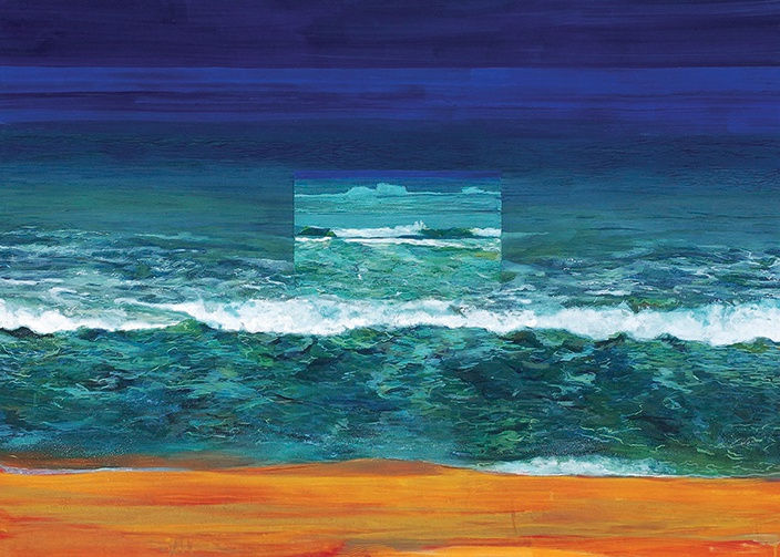 Particularly in works with layered applications of paint, fresh layers will activate previous ones and pick up their light effects as the whole compresses into one saturated surface. So even while the surface finish of casein paint is a dependably velvety matte the colours themselves appear self-illuminating. Light seems to emanate not through the paint but from it. To someone relatively new to its alchemical quirks, casein paint can become a wellspring of colour epiphanies. Baliga, who previously painted in acrylic, adopted casein paint in 2013 after producing casein-painted sections for Nilima Sheikh and BV Suresh’s mural Conjoining Lands (2013) at Mumbai airport terminal T2. He explains how its mild volatility can produce surprising effects. Depending on the base colour’s chemical provenance, applied colours could potentially alter just before they fix on the support, that is hours after they were applied. For instance, on a lead-based ground colour, as in the large casein on canvas Birth of Sea (2014), where the orange foreground extends throughout under the blue and green marine landscape to the top of the work, the applied colours gained a light phosphorescence which the artist claims was surprising when it happened, but can be mastered and internalized over time. This is the kind of heady chroma and oblique expressiveness that Baliga is consciously after, in tandem with deliberate interventions which emphasize the narrative self-sufficiency of colour.