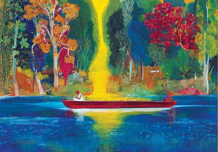 In the concurrent Baroda Poster (2013-14), which features the statue of the Brave Boy of Dhari, located in Kamatibaugh garden, Baroda, where the artist lives, a sunset intended to be pretty ended up as a pulsing yellow-orange configuration. To the artist this approximates the visual aftermath of a blast which he claims is the tenor of normal life in Baroda outside the garden’s idyll. Below, the thin ring orbiting the top edge of the island’s compass suggests that no matter how hard he tries his hand at representation abstraction prevails. This is why the foliage remains uninterrupted by vertical struts that might otherwise support the ring which is left to free-float here, and why its contents have a hallucinatory glow. Though painted in oil, this work’s high-keyed nerviness presciently reveals how colour will fine-tune vulnerable sensations in casein works begun only a few months later.