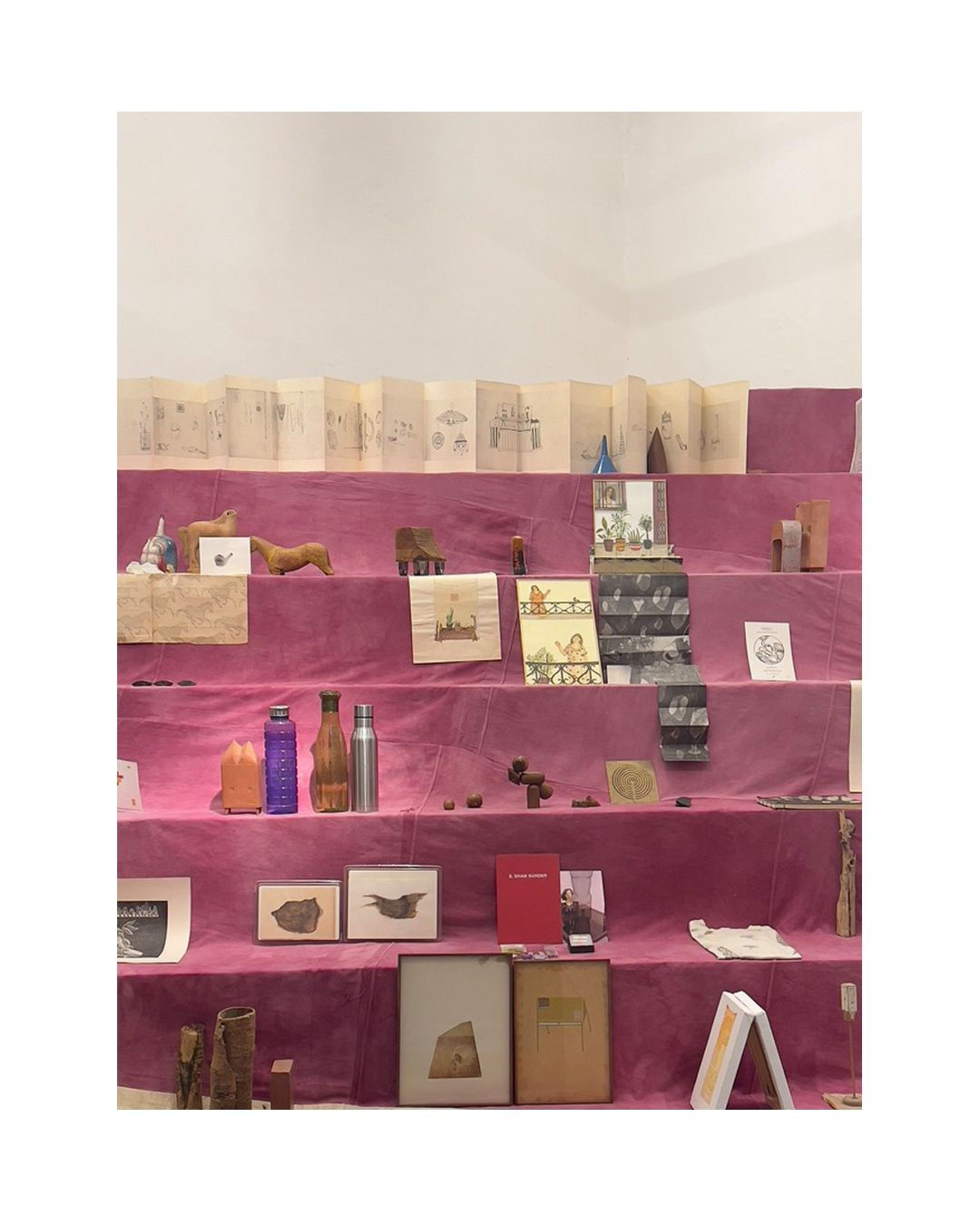 The display at Old GMC (Panjim) is a stairwell room with the flight of stairs stacked with objects, drawings and projection. The assemblage on the structure is brought together by the participating artists, who have either been part of CONA’s programming in the past or are currently associated with it. The objects, both saleable and nonsalable are trapped in the narrative of the closed shop.