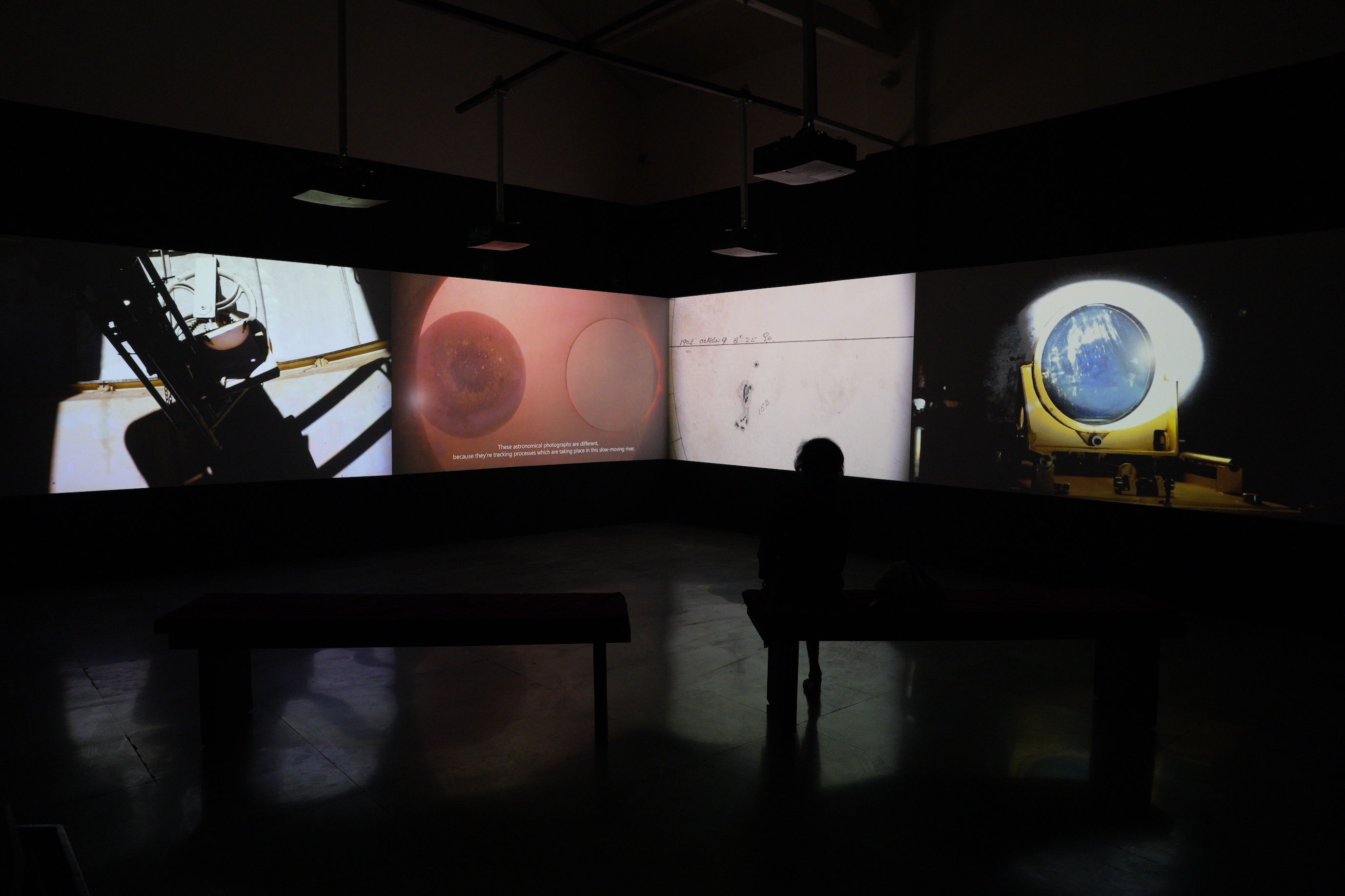Installation view of ROHINI DEVASHER’s One Hundred Thousand Suns, 2023, four-channel synced video installation, UHD, color, 5.1 sound, 25 min, at Dr Bhau Daji Lad Museum, Mumbai, 2024. Courtesy Dr Bhau Daji Lad Museum.